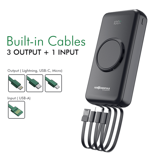Aeroessentials Charge Mate DX06S Power Bank, 20000mAh, 3-in-1 Built-in Cable, Digital Display, Black