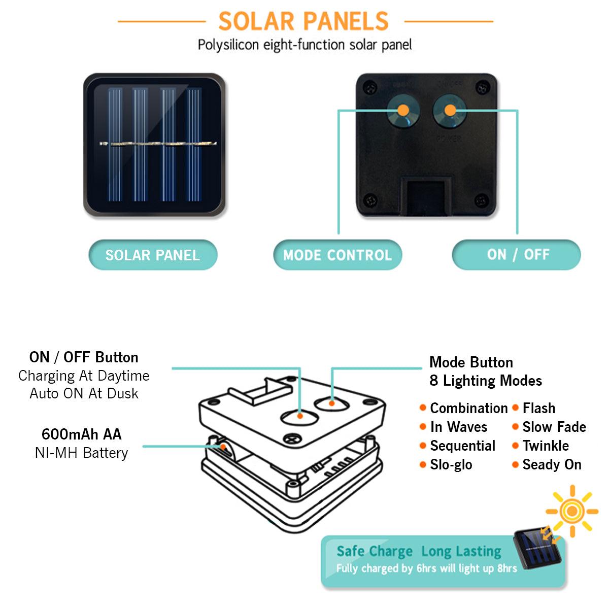 About this item solar lights features: The factory equipped sophisticated and 180 degree adjustable monocrystalline silicon solar panel plus the inbuilt 600mAh rechargeable battery, which can be recharged without sockets and wires. When the built in NiMH battery saves solar energy in the daytime, the string lights can automatically work for 8 to10 hours at night