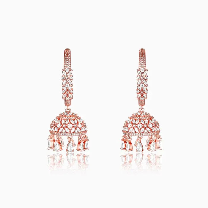 The Inspiration:The Rose Gold Statement Jhumkis are inspired by the luscious softness of a rose petal. The Design:The rose gold jhumkis have a hoop studded with zircons and a dangling jhumki dome structure with small zircons swinging at the bottom. 925 Silver with Rose Gold plating Adjustable size to ensure no fitting issues Dimensions: 5.1 cm x 1.9 cm Comes with the GIVA Jewellery kit and authenticity certificate Net Qty - 1 pair Styling Tip:Style these with a pair of white chikankaari salwar-kameez.